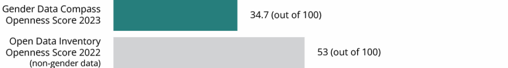 Although open formats and open data licensing are implemented relatively easily, even by countries with limited resources, the Compass’s findings indicate that less attention is given to openness of gender data than non-gender data. Figure 3 below compares the average openness score for the 185 countries in the Compass with the openness scores from the 2022 Open Data Inventory (ODIN) for non-gender data categories. Even accounting for small methodological differences, the 18-point gap between the openness of gender and non-gender data confirms that gender data are less accessible and usable than other types of data. Though the causes of discrepancy vary across countries, one trend that may account for the gap is that many countries only publish gender data in inconsistently published special reports that are often only available in PDF format. Until gender data are incorporated into mainstream data portals, the usability of gender data will continue to fall short and hamper use.