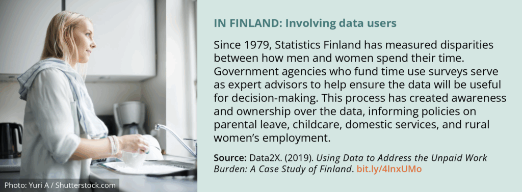The importance of data that document the realities facing women and girls is already visible. In Vietnam, data on violence against women have informed national action plans and campaigns. And in Finland, data showing disparities between how men and women spend their time have informed policies on parental leave, childcare, domestic services, and rural women’s employment.
