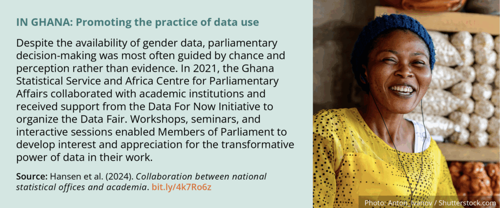 Putting these policies into practice will be essential. There are opportunities for all stakeholders to promote a culture of data use. Although the mandate of data producers and data stewards have often focused on production, modern statistical systems include promoting use as part of their mandate. Even in the absence of official policies to promote gender data, anyone can work to create a culture of gender data use. And once practices are in place, it will be all the more feasible to cement them through official policies.