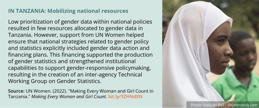 - Funding from national and international sources makes these support efforts possible when they target and promote gender data use.